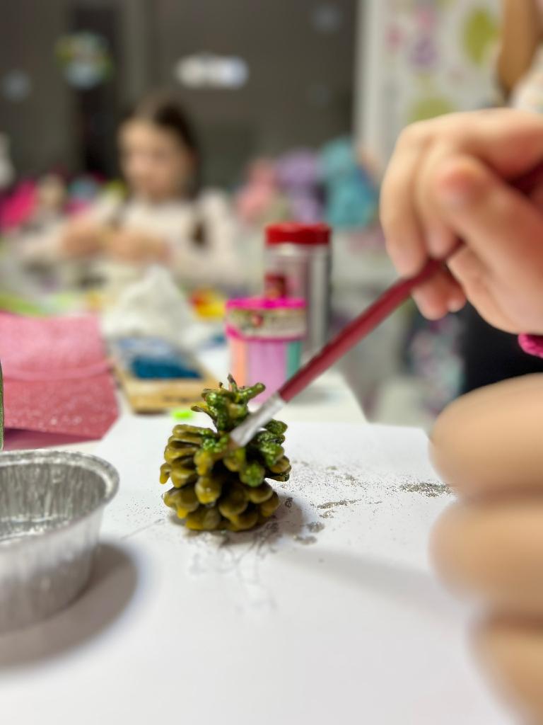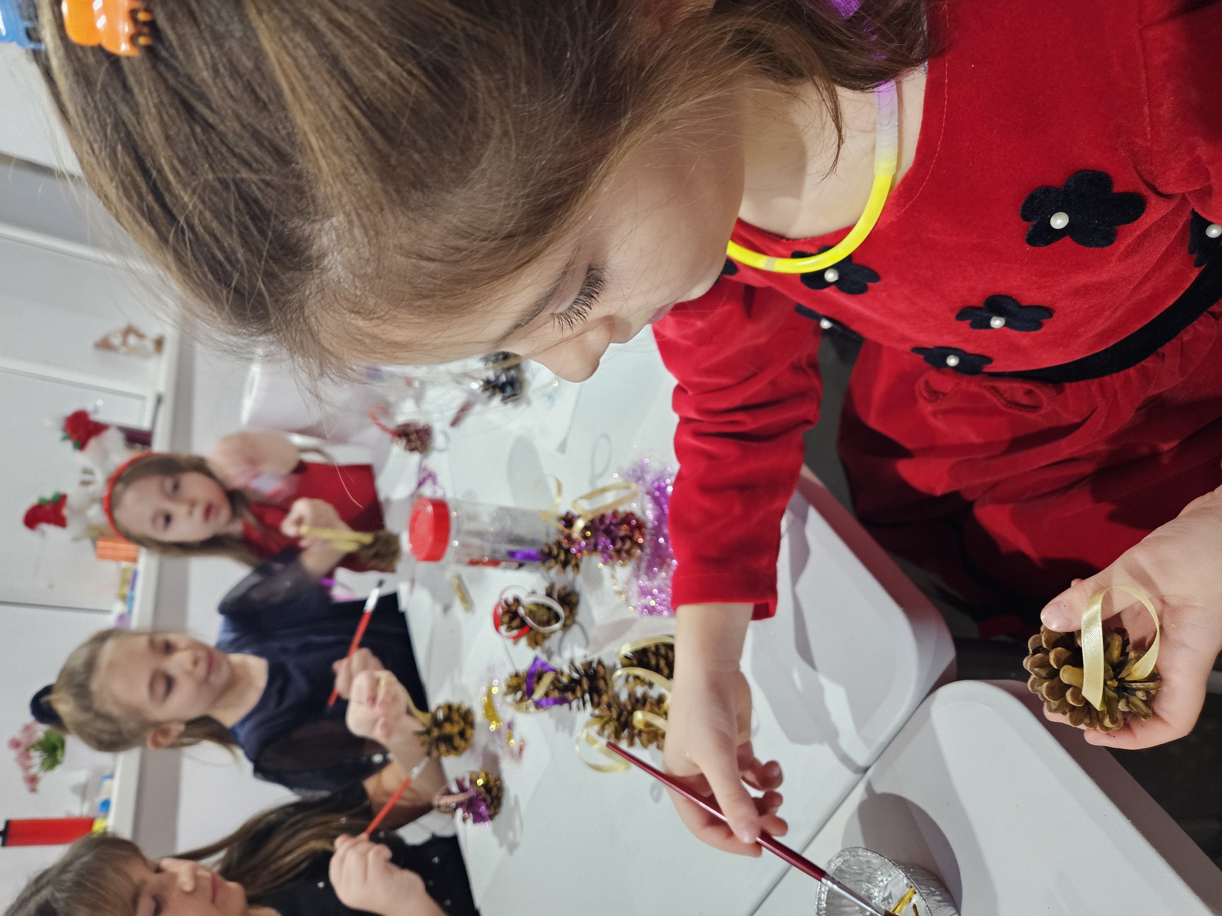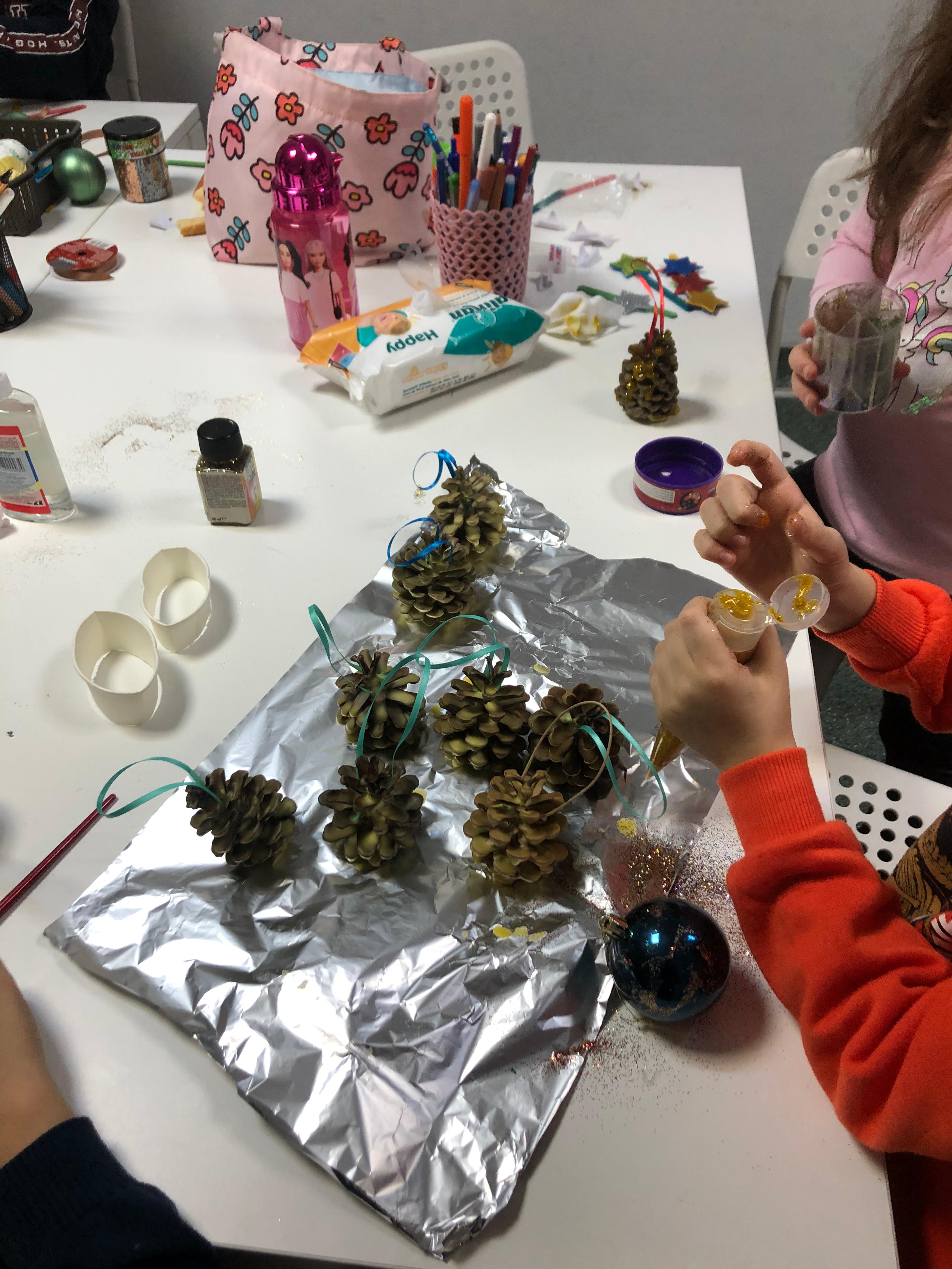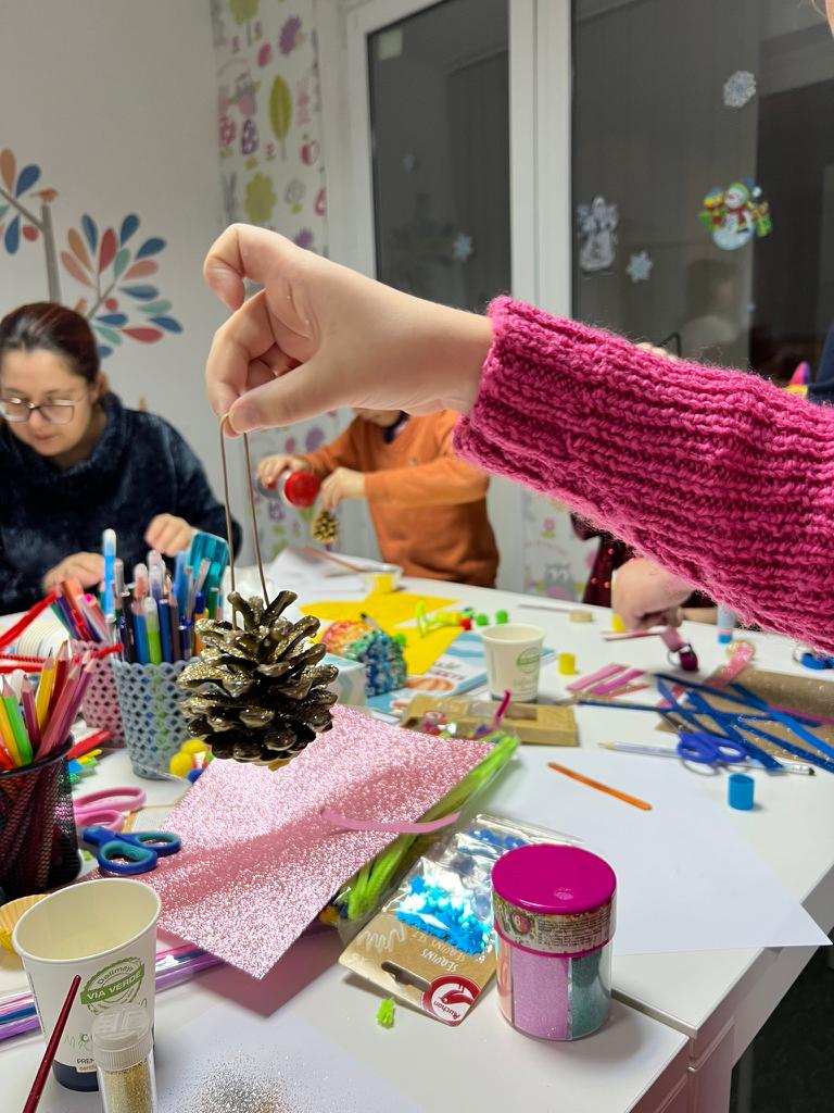 La atelierul Mânuțele Magice, cei mici transformă conuri de brad, materiale naturale și sclipici în adevărate decorațiuni de poveste. Atelierul este gândit pentru a stimula creativitatea, autonomia și bucuria de a crea obiecte cu propriile mâini.